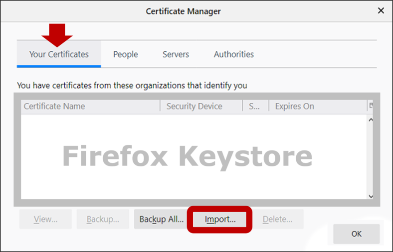 Open Firefox’s Certificate Manager and click Import