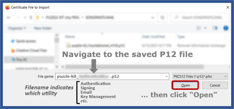 In the dialog box that opens, navigate to the P12 description file you saved earlier, and select it.